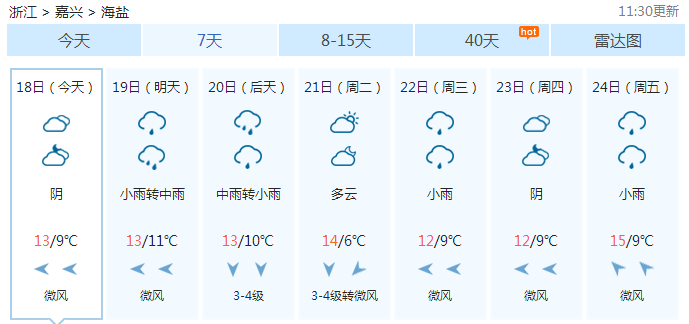 3 月19日(星期日),小雨轉小到中雨,東北風3-4級。11~13℃。