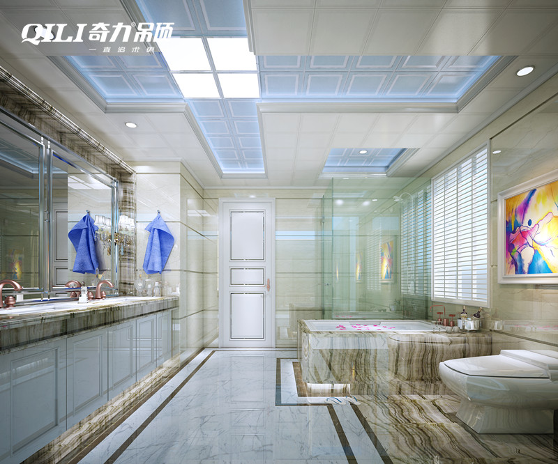 吊頂的色彩不宜太過濃重,反而會讓人覺得壓抑。盡量以淺色為主,如米黃色、象牙白色。另外,衛浴空間建議多采用鏡面及玻璃,可產生一種空曠感。