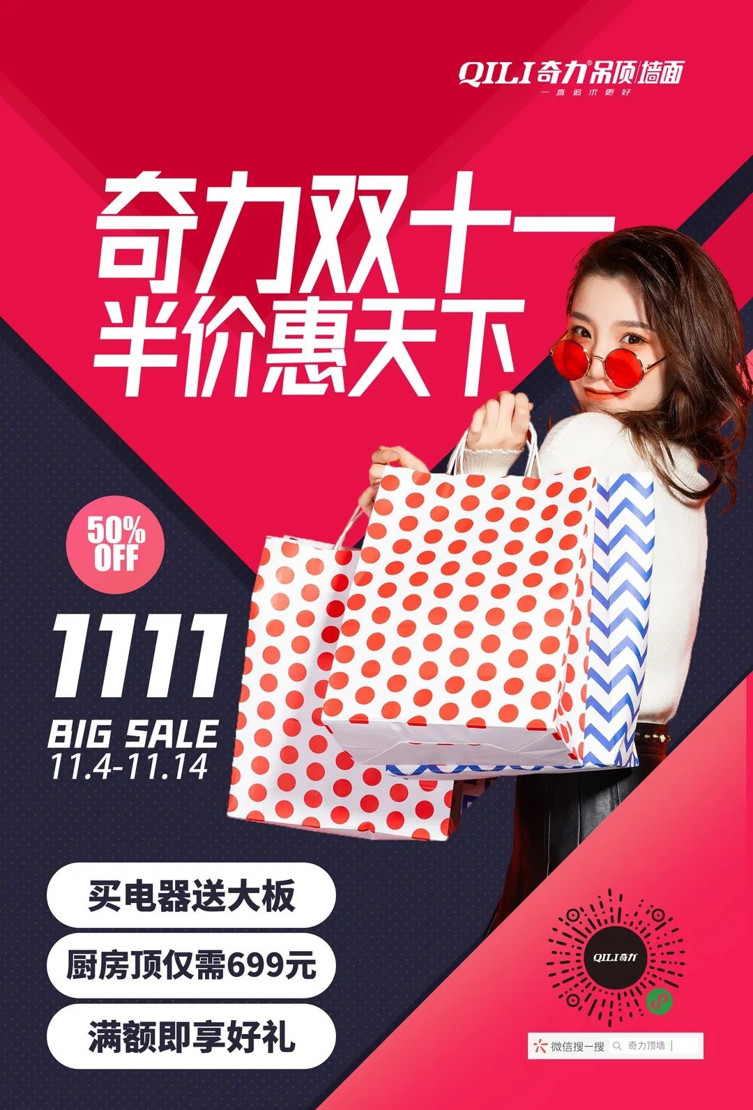 奇力頂墻雙十一活動開始啦! 全場50%的鉅惠力度 買電器送大板.....福利多多 活動時間:2021年11月4日—11月14日